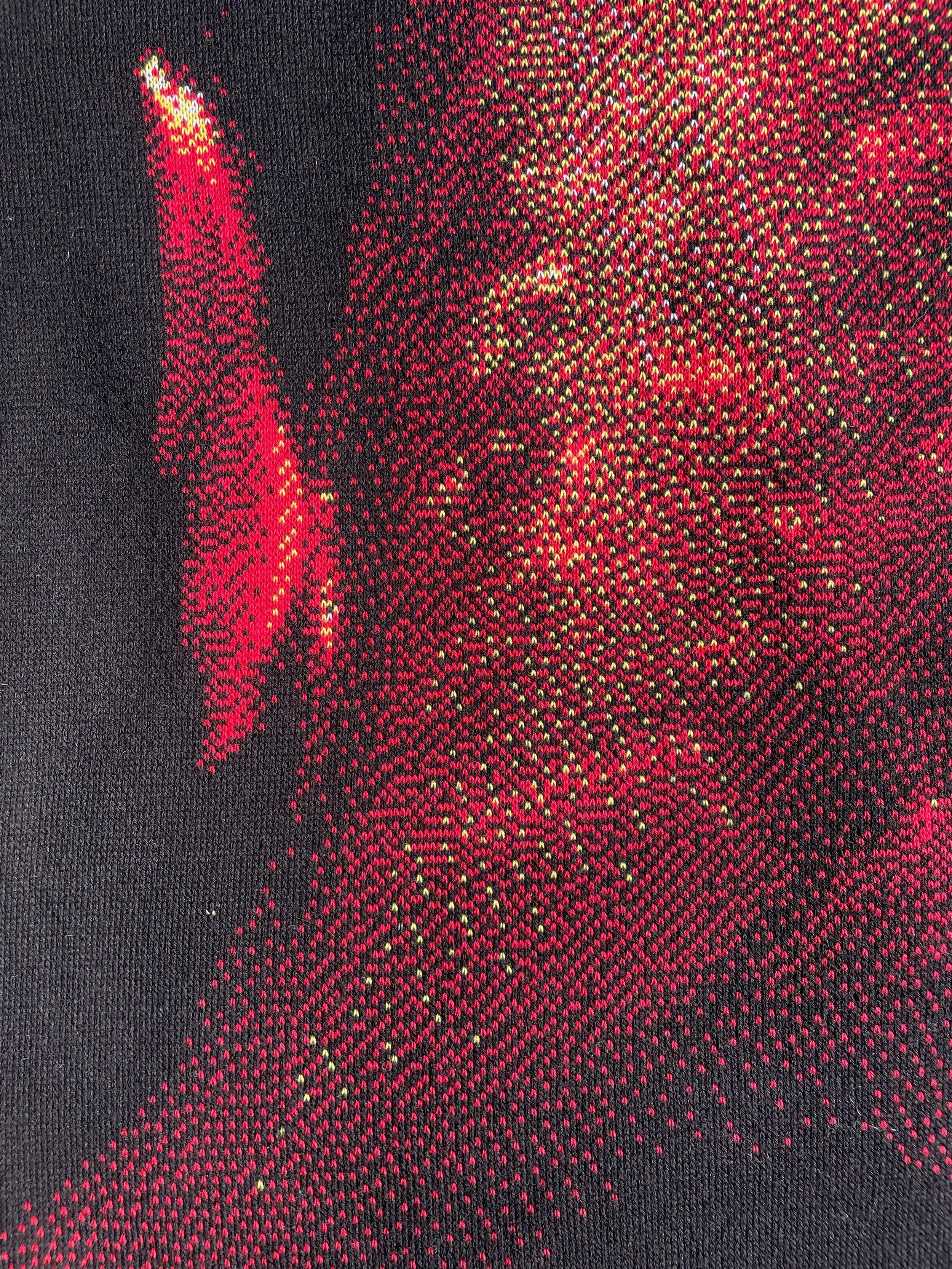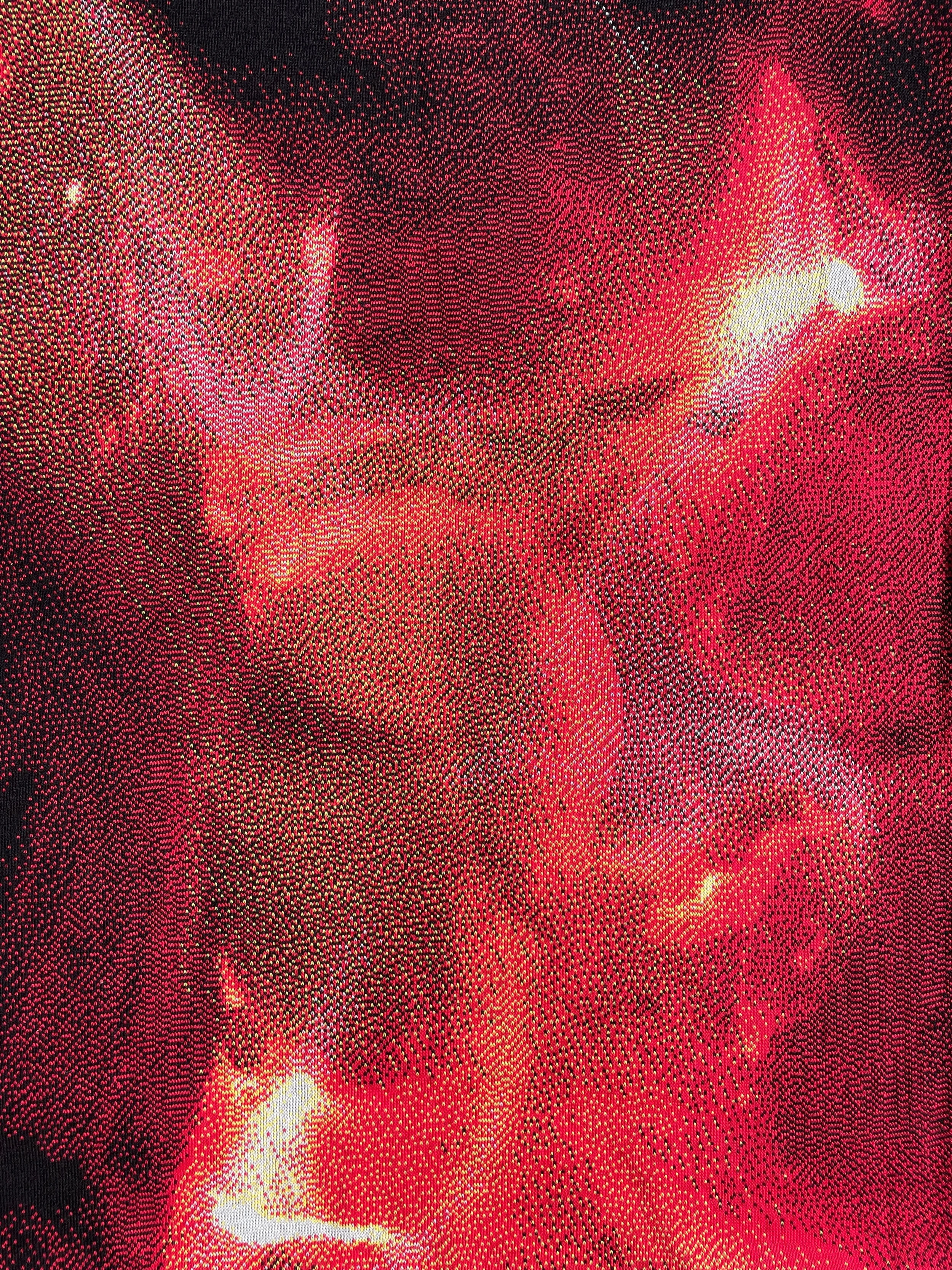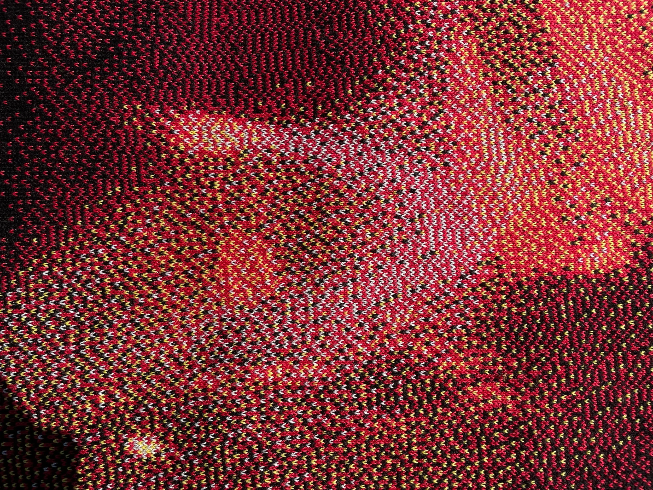 Primary photography tranlated into stitches. A blend of black, red, yellow and blue meld together to capture an image of burning embers into a cloth that drapes in a surreal way.